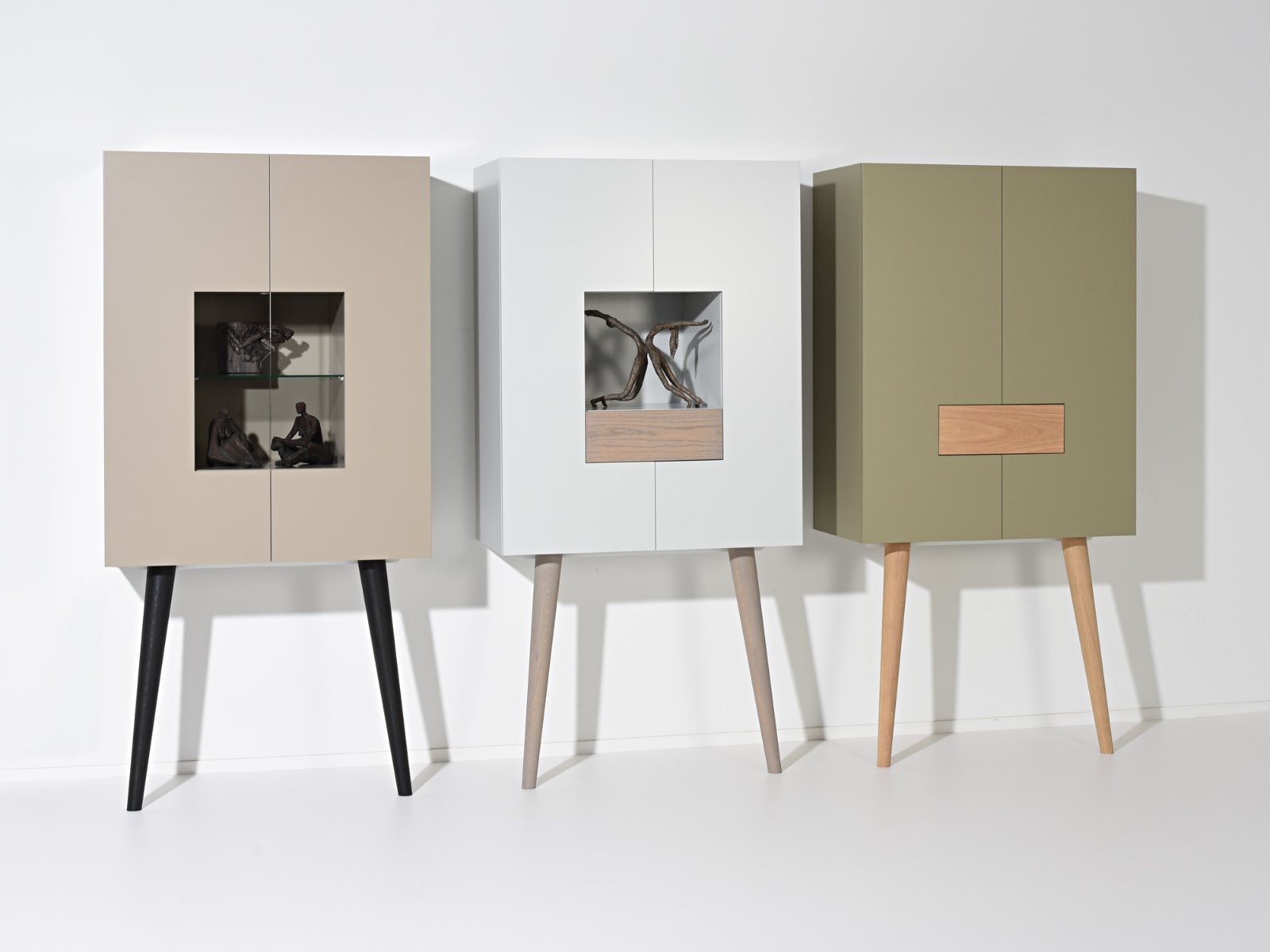 Een eigenwijs design wat direct opvalt door zijn hoge poten en het los leunen tegen de wand. Ingeboorde rubbers zorgen ervoor dat de poten niet wegschuiven en een viltstrip beschermd zowel de kast als de muur. Door de schuin geplaatste poten staan de leunkasten verrassend stabiel. Vastzetten aan de wand is dus helemaal niet nodig! De kasten zijn leverbaar in vele kleuren effectlak en de poten kunt u in diverse kleuren transparante olie bestellen.