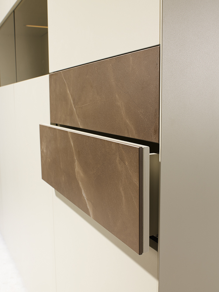 Kies uit diverse materialen zoals structuurlak, handgepolijste hoogglanslak, glas of keramiek, met 16 standaardlakkleuren en meer dan 1000 RAL/NCS-kleuren. Voor keramische bladen wordt hoogwaardige Neolith-keramiek gebruikt, krasvast en 100% UV-bestendig.