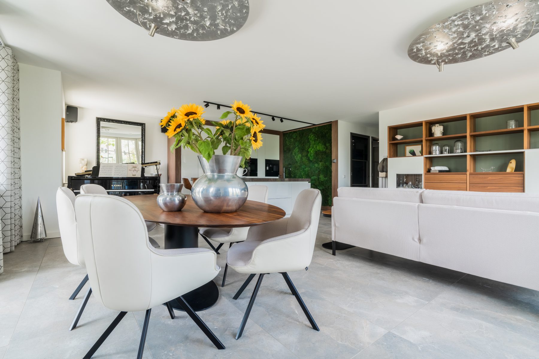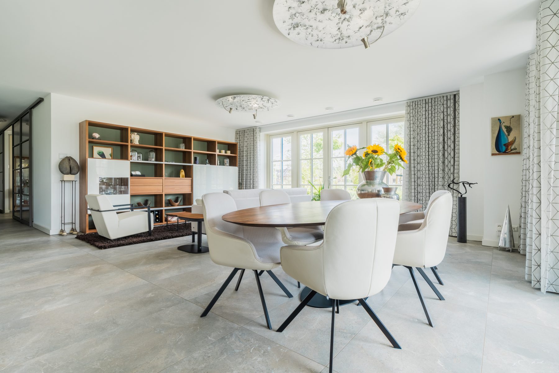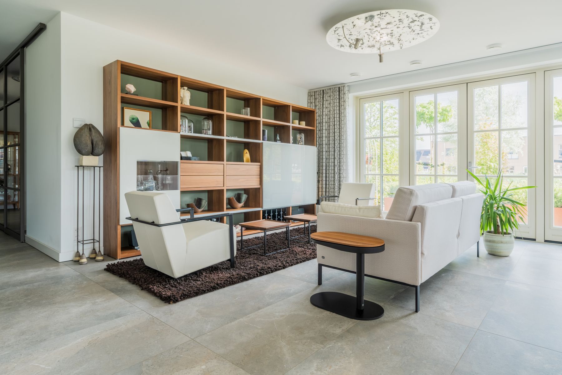 Voor de zitkamer kozen we een notenhouten tafel van Bert Plantagie, waarvan het onderstel naadloos aansluit op de bijzettafels van Rolf Benz. De Rolf Benz eetkamerstoelen in leder met stof passen er perfect bij.