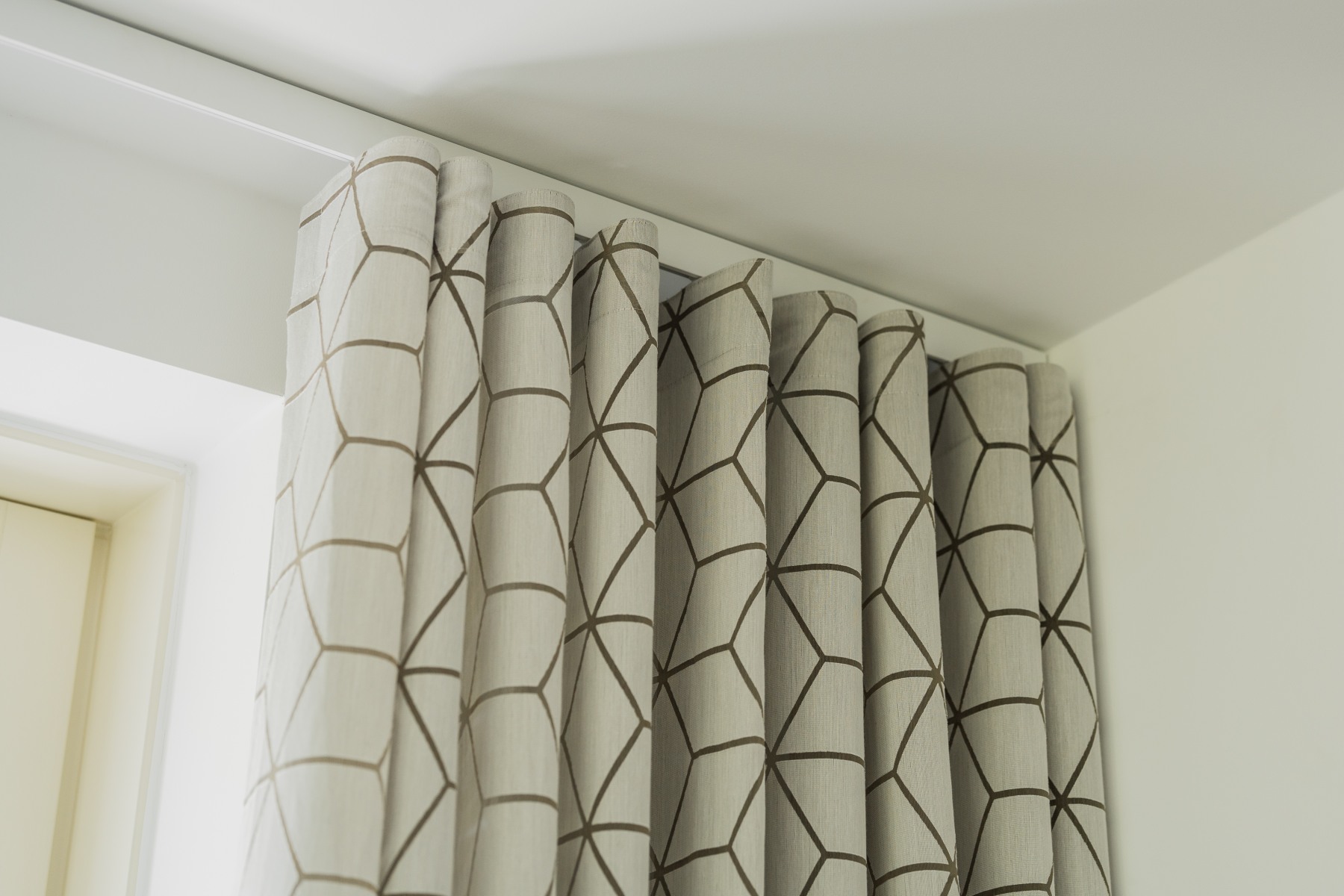 Voor de twee grote raampartijen in onze woonkamer wilden we mooie gordijnen. Alles in ons huis is bedienbaar via domotica, dus we wilden elektrische gordijnrails. Raimond vertelde ons dat we even moesten wachten op het Duitse designmerk Interstil. Na een lange wachttijd werden de rails eindelijk opgehangen.